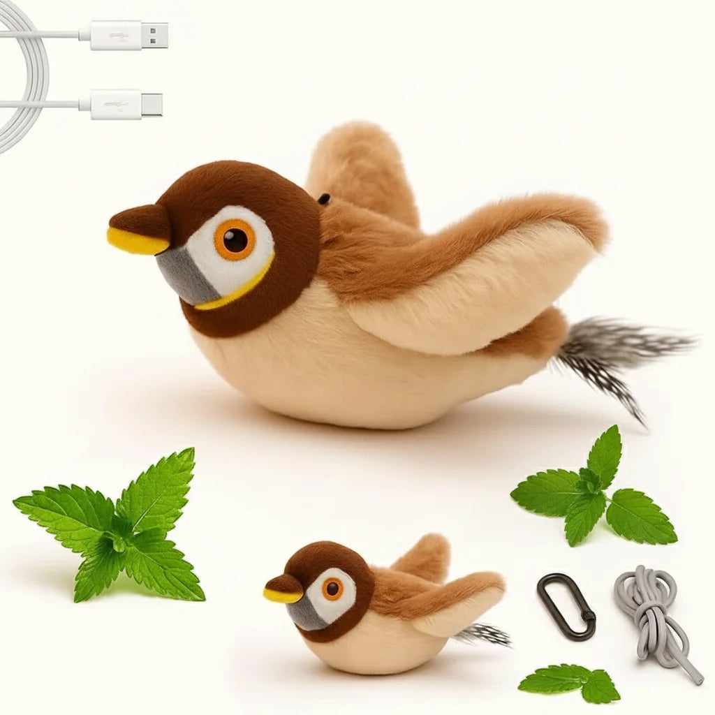 Mira cómo sus alas aletean y emite sonidos irresistibles, ¡como un pájaro de verdad! Tu gato no podrá resistirse a la caza.